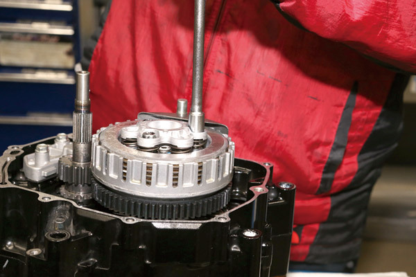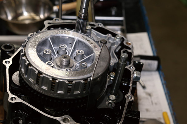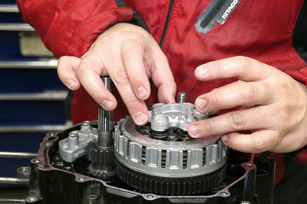 クラッチセンターにワッシャーを忘れずに装着し、クラッチスプリング、リフタープレートを取り付け、3本のボルトは均等に締めます。規定トルクは12N・m