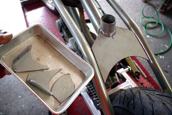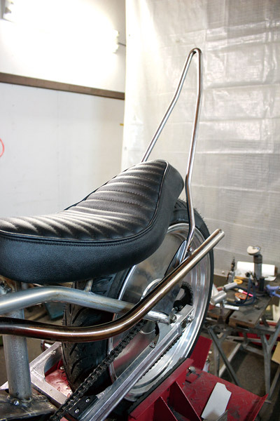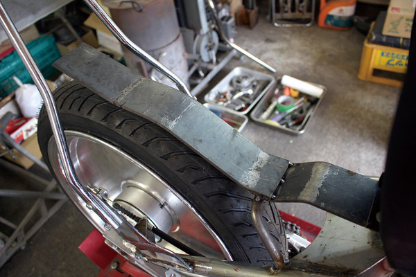 シート低板の形に添うように鉄板を曲げてシート下の受けを作りました。最終的に後方でシーシーバーと合体させます。