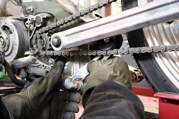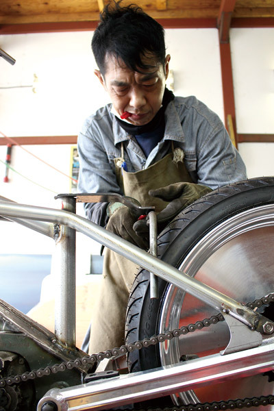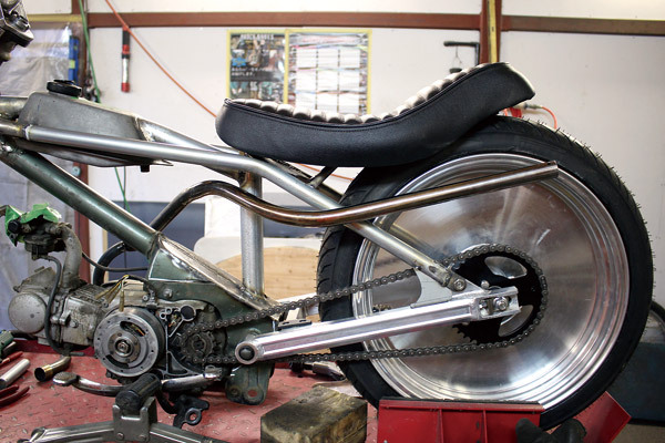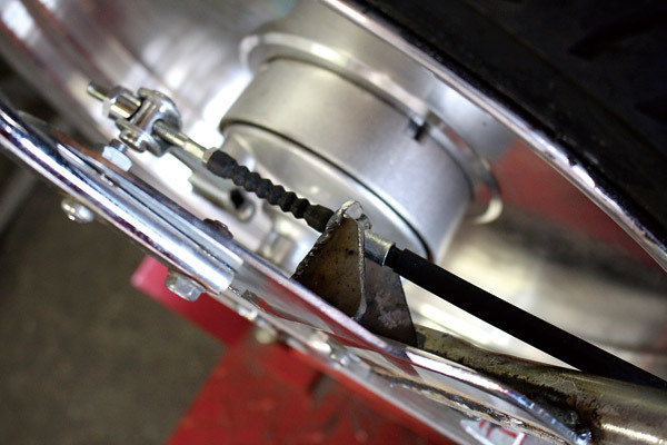 超〜ローダウンな上にリジットにしたので、チェーンがスイングアームに…。そこでガイドローラーも追加しました。