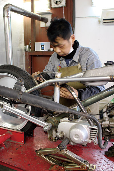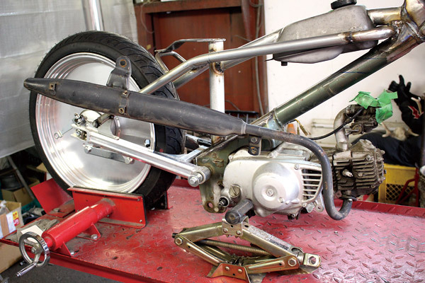 マフラーのマウントはシーシーバーに。ステーやマウントボルトが見えないようにこだわって作りました。