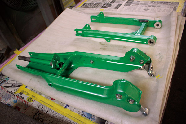 サイドのサブフレームとシートパイプ、そしてサブフレームとスイングアームと繋げるガゼットプレートも取り付けます。