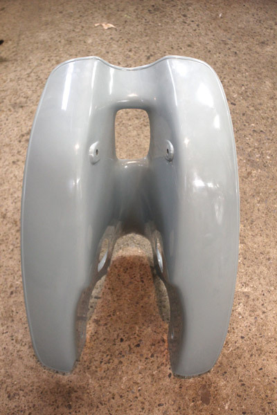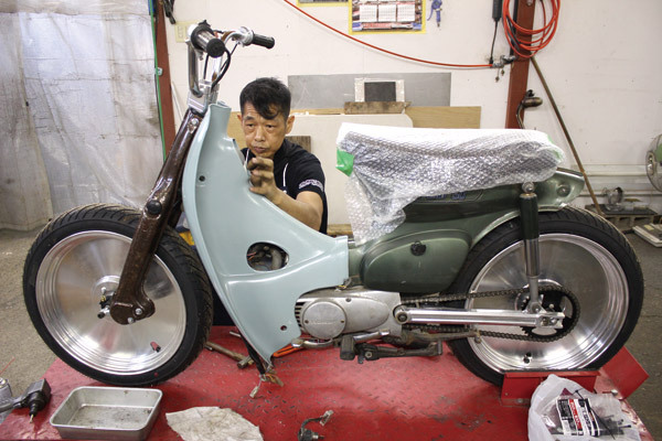C50のレッグシールドは幅が狭く、今回装着したワイドフォークでは取り付け出来ませんでした。そこで用意したのがC50よりも後方に取り付けられるC100用(リプロ品)。もちろんステーはワンオフしなければなりません。
