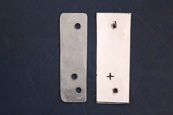 紙で作った型と実際に作ったステー。中間の穴にレッグシールドをマウントするのです。
