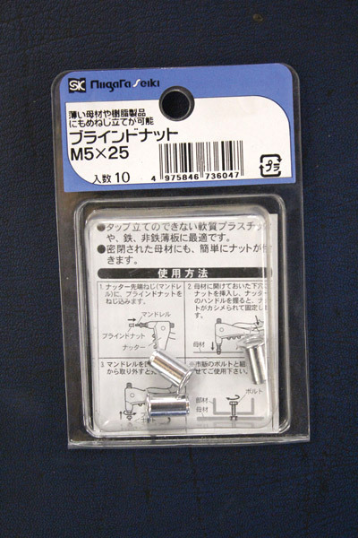 レッグシールドをマウントする穴は後側にナットを付ける余裕がなかったのでM5のブラインドナットを取り付けることにしました。