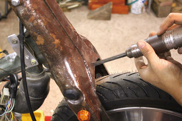 レッグシールドの上部分ステーはこのフレームのボルト穴から生やすことにしました。