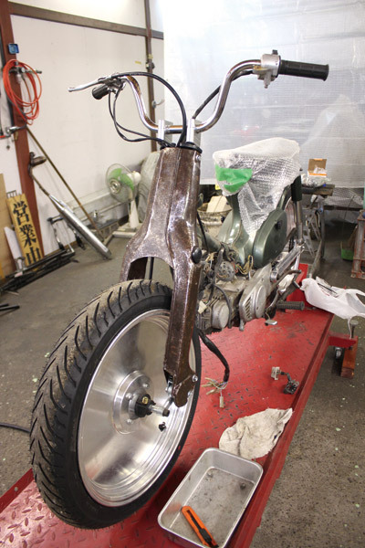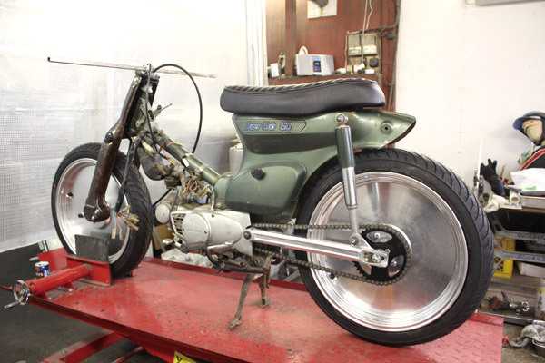 9月号のスタートからアルミスイングアームやシート、ワイドフォーク、デッシュホイールの取り付けを紹介してきましたが、今回で‘一旦’の完成させます。‘一旦’と区切りをつけたのは用意したパーツの装着が完了したため。各部に加工や、別途用意するものもありましたが、なんとか形になりました。まだペイントもしていませんが、前後超ワイドな上にこれまでにないディシュホイールという斬新なスタイルは見ていただけたハズ。