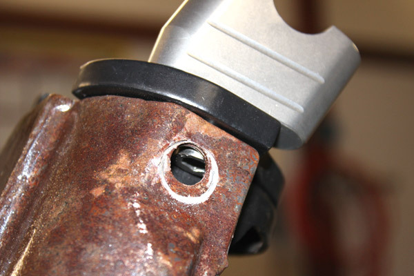 頭を細くして入ったものの、今度は高さが合わなくてこのままでは横から入れるボルトが入らないという…。そこでボルトの頭の高さも低く加工しましたハンドル取り付け。