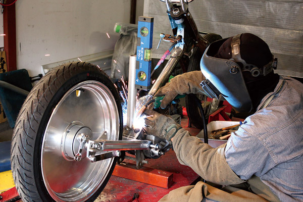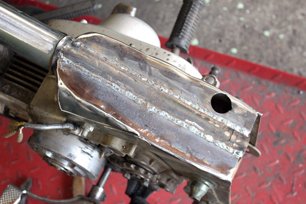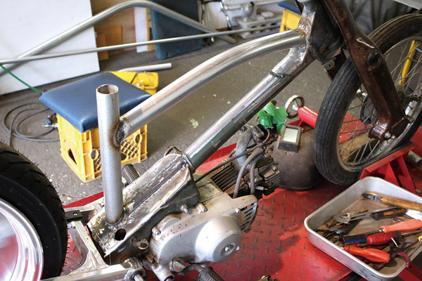 エンジンマウントの上に付けた鉄板から垂直方向にシートポストとなるパイプを立てていきます。このあたりは水平器で見ながら慎重に作業していきます。