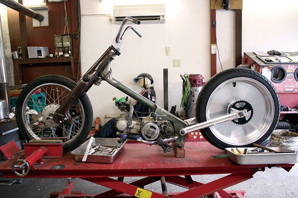 スイングアームが寝ていますがリジッドフレームになるのでこの状態から上下には動きませんから問題なし。チェーンはギリギリなのでガイドローラーを追加予定です。