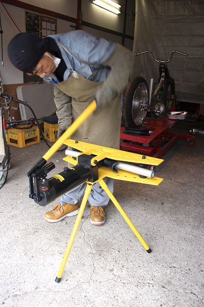 続いて追加のシングルフレームを作ります。パイプベンダーを使って曲げていきますよ~。一体どんな形になるのでしょうか?