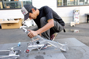 あかおぎの鈴木さんもGC-022の現物を見るのは初めてで、「ふ~ん、ココがこうなって…、フムフム…」と興味津々な様子。スイングアームはこのフレームに合わせた16cmロングタイプ。うっとりとするようなアルミの骨格がドンドンと組み上がっていきます