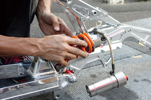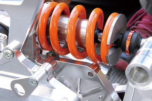 リアショックはNSR系が使用可能ということで、今回はビビットなオレンジのスプリング&お手頃な価格でリザーバータンク付きの、高性能なシフトアップ製レーシングリアショックをチョイス。リザーバータンクの取り付け場所&ステーがない…、どうしましょう…