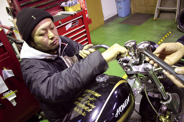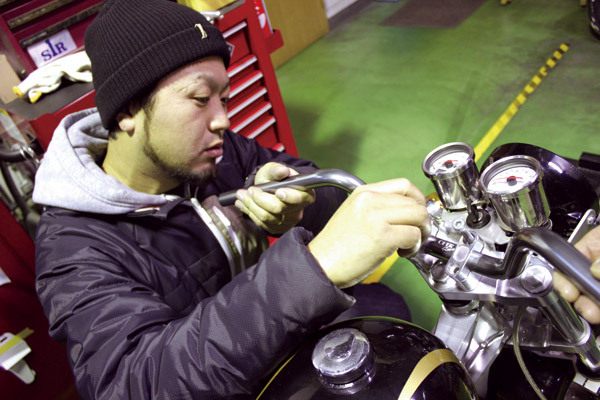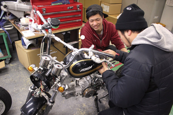 1件目で話が盛り上がり、OVERへの到着時にはあたりが既に真っ暗に。ということで、特別に工場&工具をお借りして自分で取り付けスタト!!