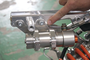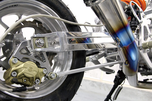 今回は先月号で取り付けたリアショックのリザーバータンクを取り付けるべくGクラフトさんへ。ちなみにこの車体、ENJOY4MINI時にGクラフトさんブースにあったのお気付きになりました? ご好意で飾ってもらってました。展示するのに合わせ、各部パーツも装着されておりラッキー☆ とそんなことはさておき、問題だったリザーバータンクはリザーバータンクステー(¥8000/税抜)をベースにステーは試作品を作って頂きました。オーリンズやナイトロンとタンクの太さが違うため割りカラーを用意してもらい取り付け。トルクロッドのアイデアもさすがです!!かなりいい感じ!!