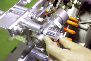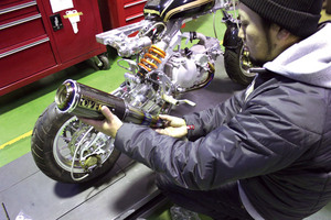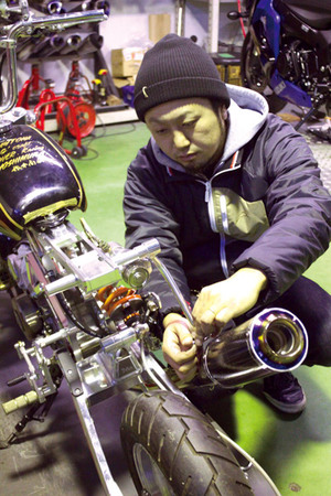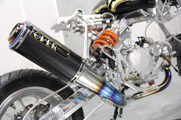 大迫力のGPパフォーマンスXLのサイレンサー。このサイレンサーに負けない車体にしなくては…。あっタイヤもカッチカチでした…