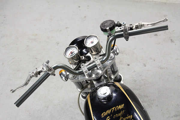 独特な曲げで絶妙なポジションのセミアップハンドル。2連メーターも少し古くさいイメージなので、新たに用意するしかないか…