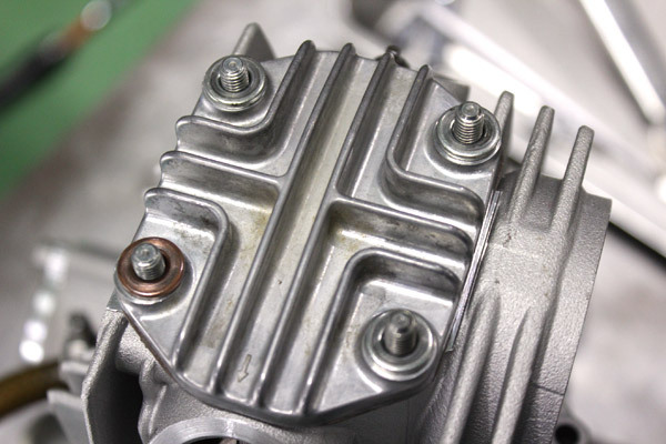 ヘッドナットを組む前にはワッシャーを入れるのですが、ヘッドカバー矢印の部分のみ銅ワッシャーとなります。ここがオイルラインとなっており、オイル漏れし難い銅ワッシャーを使用しているのですヨ