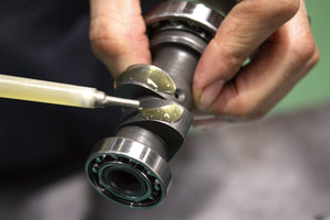 カムを組み付ける前にもオイルをタップリと塗布します。カム山、オイル経路、そして左右のベアリングとツルッツルにしておきましょう