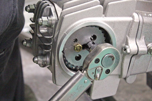 カムスプロケットを取り付ける前にカムチェーンテンショナーを緩めておきます。チェーンが張ったままでは取り付け出来ないのです