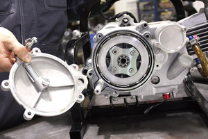 ボルトを外しクラッチカバーも外します。この時にクラッチアームを少しだけ動かしながらやるとスムーズに取り外せます