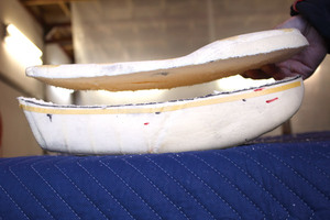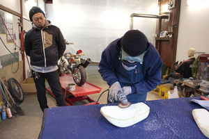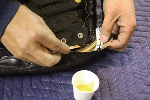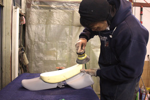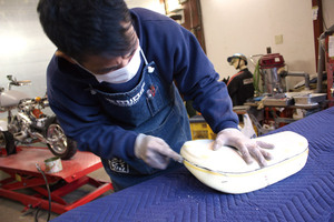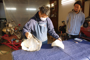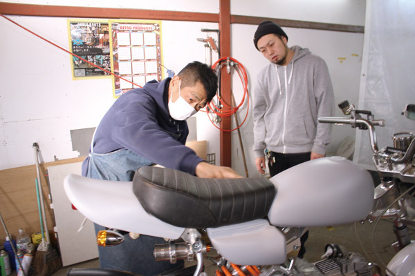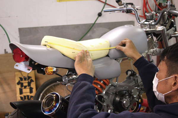 最後にもう一度車体に組み微調整。形状が決まったらシワが出来ないようにひっぱりながらシート表皮を張っていきます。小林さんの多彩な才能には言葉が出ません