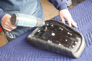 外装を装着し車体を見ていると…、シートがモッコリしているような…。ということでアンコ抜きします!!ヒートガンを使いシート表皮を剥がしていきます