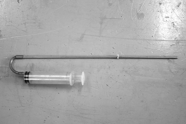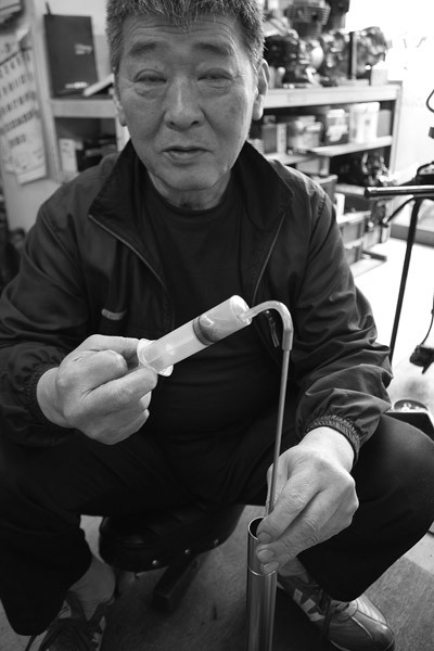 新庄さんが使っているのは一般的な注射器にホースと中空パイプを繋いで作った手製の調整機です
