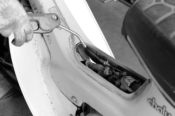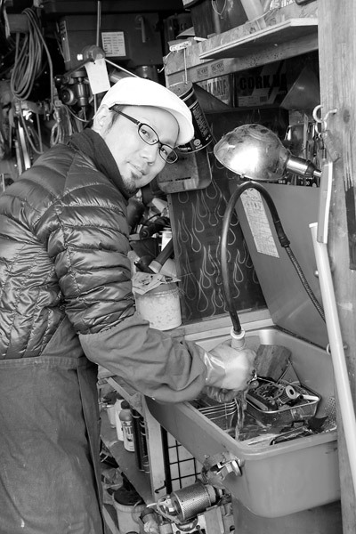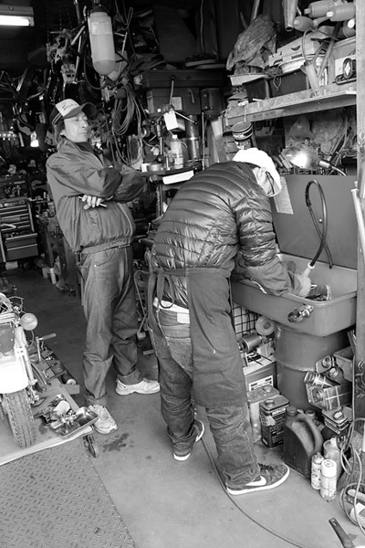 バイク歴はそこそこあるくせに、4ミニはビギナーの河又が、少し前に知人から譲ってもらった不動のシャリィをレストア&カスタムをしていく本企画。記念すべき第一回目のお題は「これエンジンかかるの?」です。というのも、僕のシャリィは30数年前のモデルらしいのですが、15年ほど放置されていたため。そこで今回はとりあえず現状でエンジンがかかるかをチェックすることで、どのあたりが傷んでしまっているのかを把握しようという目論見です。そこでキャブ、エアクリ、マフラーなどをひと通りチェックしてみると、エアクリは異常なほど綺麗な状態。マフラーは何かの巣ができていて排気口は詰まっていたものの、サビで穴が空いているなんてことはなく、どちらも軽い掃除で再利用可能でした。キャブをバラしてみると、まるでコールタールのようになったガソリンが内部にこびりついて、これを取り除くのがもう大変! 洗浄液に浸けて汚れをふやかそうにもほとんど効果がない。アカオギの鈴木さんの提案で鍋でキャブを煮てみたり、僕が歯ブラシなどで地道に手作業で除去作業をし続け約2時間。
