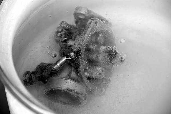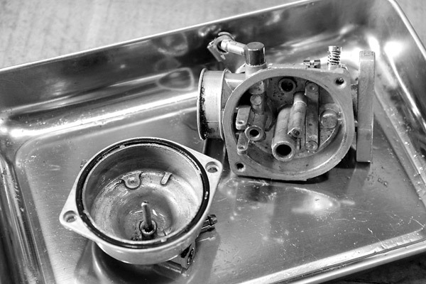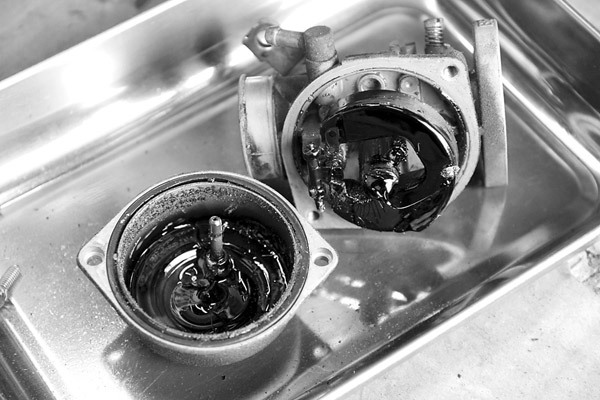 キャブをバラしてみたら、中には腐って水飴のようになってしまったガソリンがベッタリ! これは取り除かなきゃ!