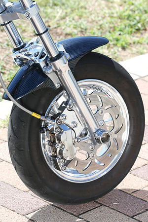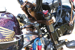 メッキタンクに合わせて、Gクラフト製のGC-020アルミフレーム、アンダーチューブ、フロントフォークのボトムケース、キャリパーなどなどいたるところがピッカピカ! 外見もさることながら中身も凄い。エンジンは武川製のコンプリートエンジンを搭載し、マフラーにはOVER製の手曲げチタンとゴージャスな1台なのです。