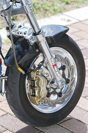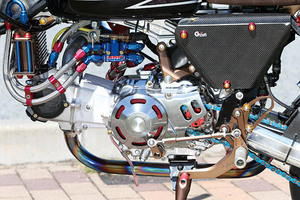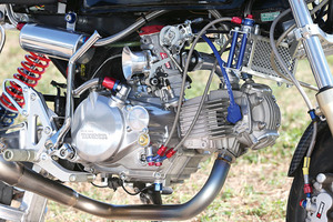 数多くのパーツが付けられながらもバランス良く綺麗に仕上がっていますね。エンジンは武川製のボアアップキットで排気量は124ccとなっており、乾式クラッチ、5速ミッションの組合わせ。エンジンやマフラーにどうしても目が行きがちですが、フロントフォークをDLC加工するなど通なカスタムをしているのが粋ですね。
