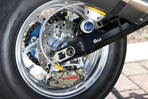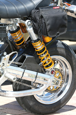 リアショックにはみんなが憧れるオーリンズ製。スイングアームはGクラフト製のスタビ付で、剛性はバッチリ! カーボンのチェーンカバーがいいアクセントですね