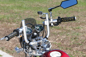 武川製のアジャスタブルハンドルは、好みや体格に合わせて高さや角度が調整できる優れもの。スピードメーター、タコメーターも武川製