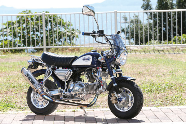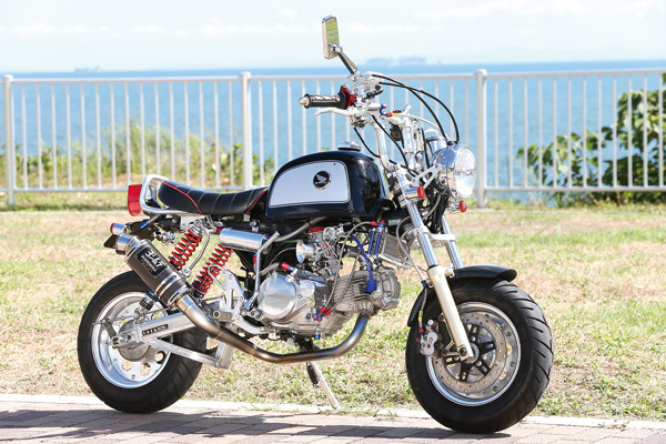シャープな印象を受けるモンキーは、エンジンには全て武川製のパーツを組み込み、吸排気系はヨシムラ製のパーツでまとめています。ダーク系のカラーリングで統一していることで落ち着いた雰囲気が◎。