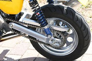 OVER製のマフラーはルックス、性能、サウンドとどれをとっても一級品の人気アイテム。スイングアームにはシフトアップ製を装備しています