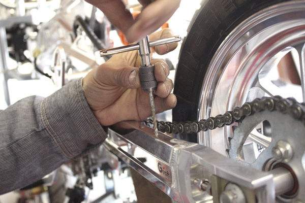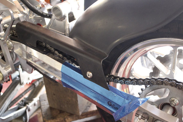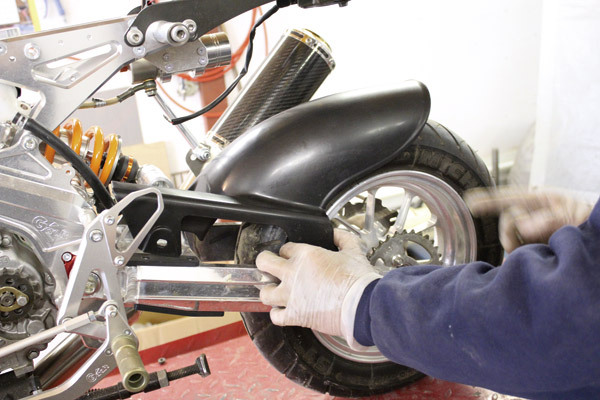 勿体ないと思いつつも潔くスイングアームに加工を施し、フェンダーを取り付けていきます。バッチリ付きましたが、まだこれで完成ではありません