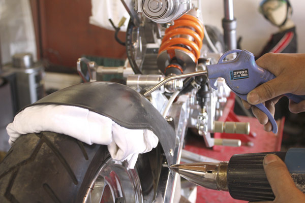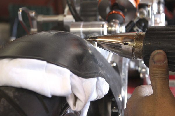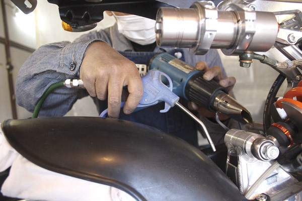 フェンダーとタイヤがあたってしまっている部分があるので、ヒートガンで炙りながら曲げ、クリアランスを作りエアーで冷やし固定します