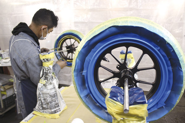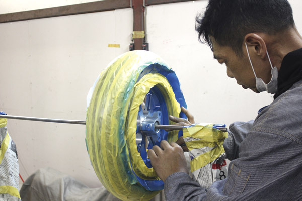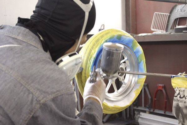タイヤに塗料が付かないように写真のようにマスキングしてサフェーサーを塗ります。あまり見慣れないやり方ですが、クルマの場合は車体にホイールが装着された状態で、同じようにマスキングしてペイントすることもあるそう