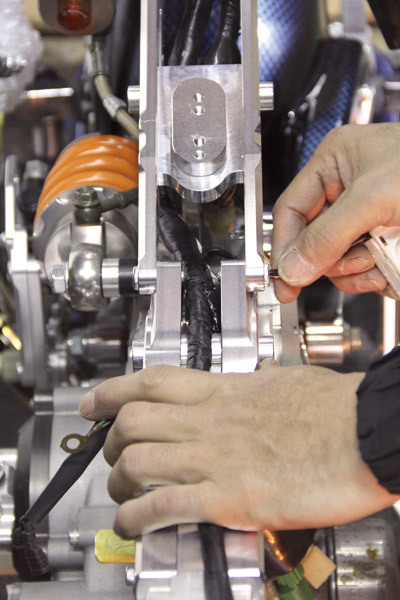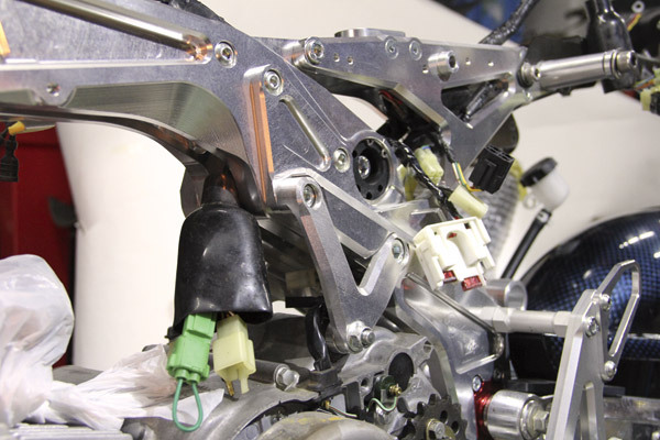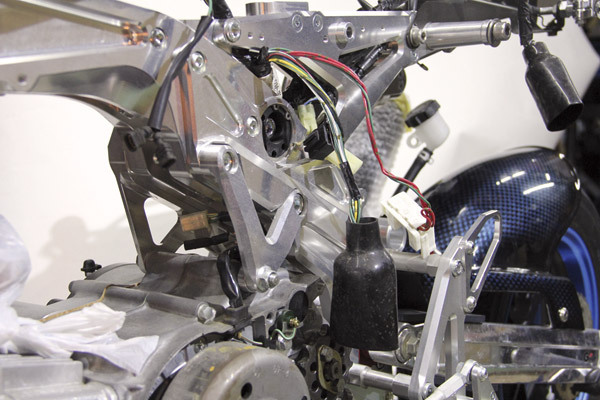 メインハーネスをGC-022アルミフレームの形状に這わせていきます。純正とは違い、どう納めていくか、知恵の輪のような状態。いかにキレイに、目立たせなく出来るかがポイント