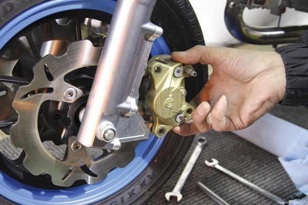 ブレーキ周りはブレンボも今更感があったのでここは思い切って交換しちゃいます!! フルードを抜き、キャリパーを外していきます。ペイントしたホイールが怖い~