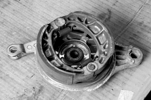 バラしてみたところ、前回同様あんまり傷んでいない…という誌面的にはあんまり盛り上がらない結果に…。でも僕的には嬉しい結果!! ブレーキシューにいたってはほとんど減ってなかったっす!