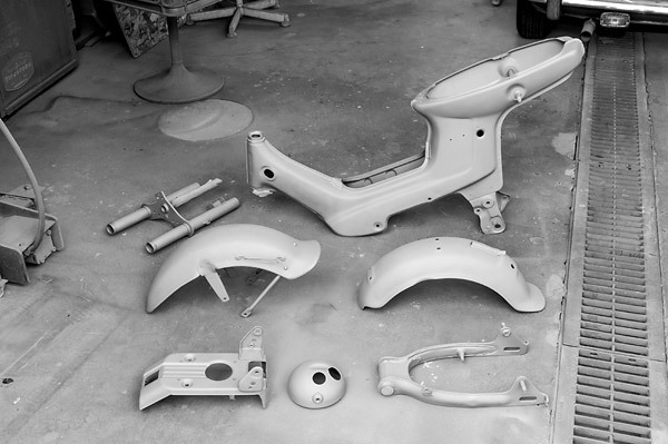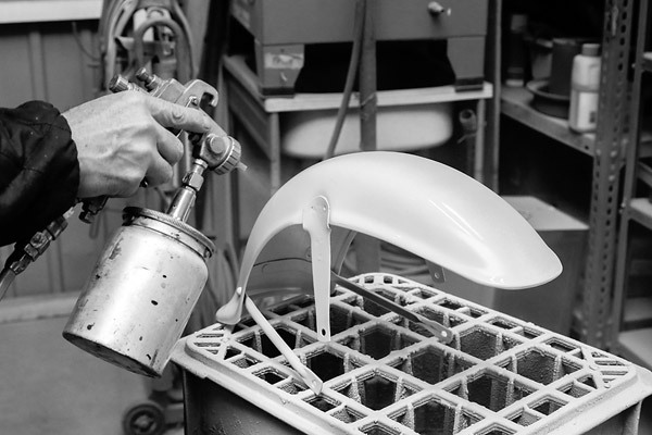 今回はいよいよペイント! 塗ってくれるのは前回のサフェーサー&板金をしてくれた、ガレージマイスターの廣瀬さん。ペイントするにあたり、色のチョイスにはかなり悩みました。僕のシャリィは色々と手を加えてきたものの、ほぼノーマルな見た目なので派手なカラーリングは似合いません。であれば、ノーマルの雰囲気を壊さず、それでいておしゃれにしたいと試行錯誤。そこで導き出した色が空のような水色、さらに艶消し! ピカピカにするよりも艶消しにすることでレトロな雰囲気を出そうと考えたのです。