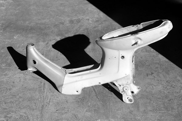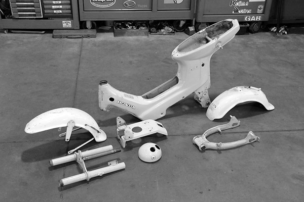 ペイントするにはまず純正の塗装を剥がす必要があります。そして剥がすには車体をバラさなければなりません。そこで、山梨県のガレージマイスターさんにお願いして、車体の全バラを敢行! さすがシャリィカスタムの第一人者だけあって、作業が早い早い。アッという間に僕のシャリィはバラされてしまいました。多くのパーツにはゴム製のパッキンが付いていたのですが、全て外しておきます。というのもサンドブラストかける時、付けたままにしてしまうと、塗装と一緒に取れてしまい再利用できなくなるためなのです。