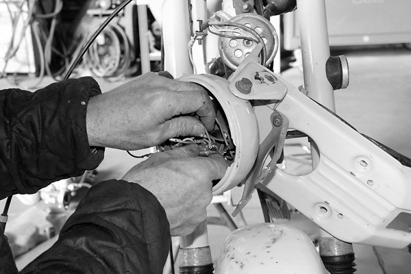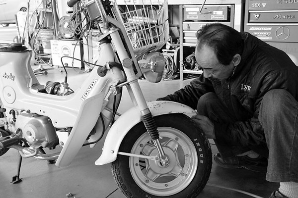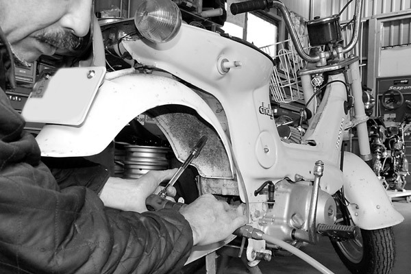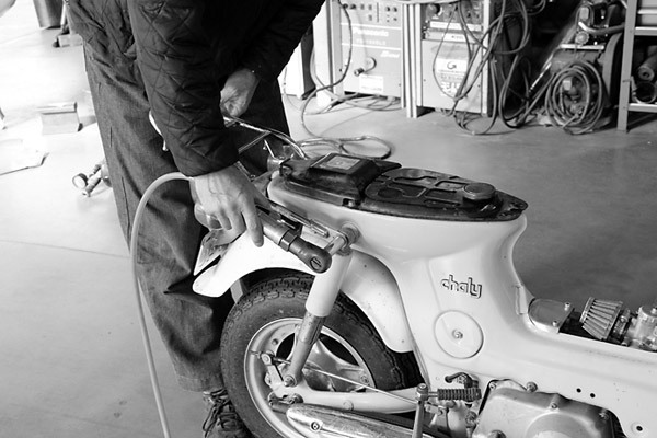 全バラすべく作業開始! シャリィのカスタムを得意とするガレージマイスターの廣瀬さんに依頼しました。まずはシート、キャリア、レッグシールドなどの外装を外しますよ〜
