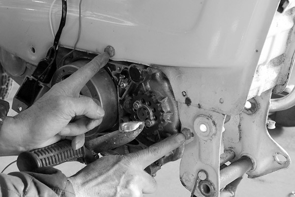 リア周りが終わったらエンジンを降ろします。そのまま降ろそうとしたらキャブが干渉してしまったので先に外しました。あとは2本のボルトを抜けば降ろせます