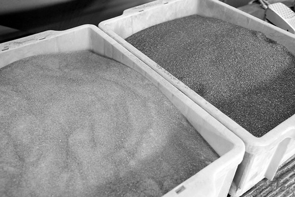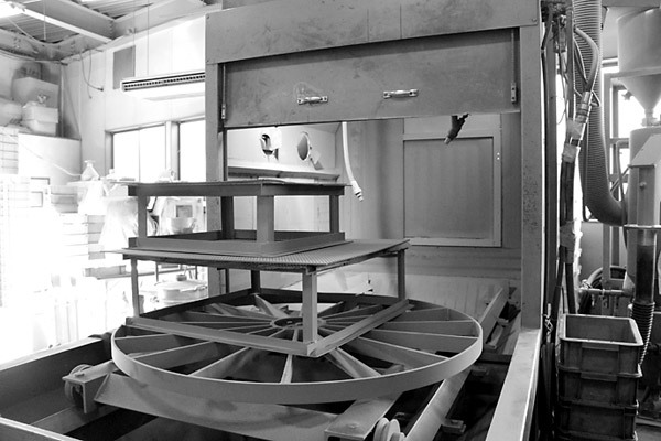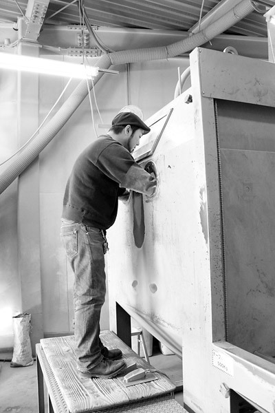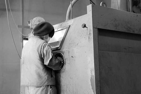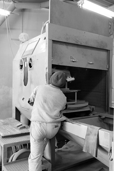 この大きな箱のようなものは、大型のサンドブラスター。ここにバラしたフレームを入れ作業開始。熟練の技でみるみるうちに塗装が剥がれていきますよ〜