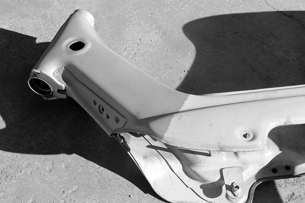 サンドブラストしたところはこんなに綺麗に塗装が剥がれます! ブラスターから吹き付けるサンドには種類が沢山ありますが、用途に応じて使い分けられています。ちなみに純正の塗料は分厚いことが多く、剥がれにくいと聞いていましたが、僕のシャリィは塗膜が薄かったのか思いのほか簡単だったようです