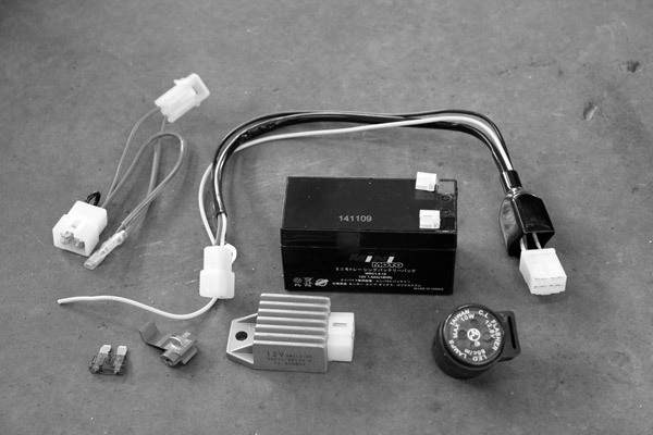 ヘッドライトの電球を見てみたら「6V15W」と書いてあるではないですか! これを解消するには電球のW数を上げるより、今後のカスタムの拡張性を考え12化してしまおう、ということで今回の作業となりました。取り付けたのはMINIMOTO製のコンバートキット。必要な配線やウィンカーリレー、そしてバッテリーも同梱されているオールインワンなキットなのです。説明書に従い、純正のハーネスにキットの配線を割り込ませることで手軽に6Vを12V化できるんです。ただ、上でご紹介しているように、車体に合わせて配線の加工や延長が必要になってくるケースもありますので、作業に不安が残る方はお店にお願いしましょう! 自分で作業する場合は、配線加工に必須な電工ペンチやギボシを準備することを忘れずに!