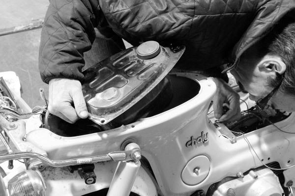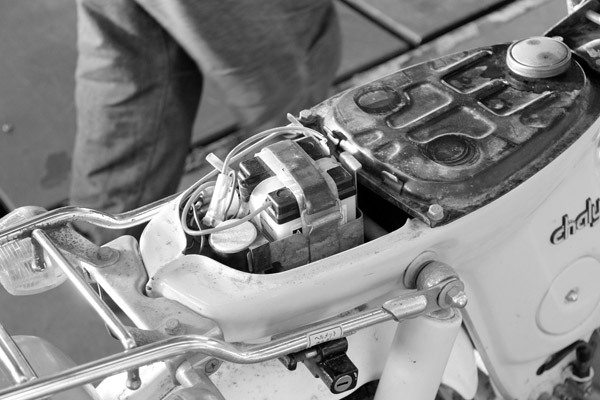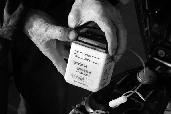6Vから12Vにするためいざ作業開始! まずはシート下にあるバッテリーを外します。といっても、ゴムバンドとギボシを外すだけの超簡単作業