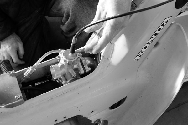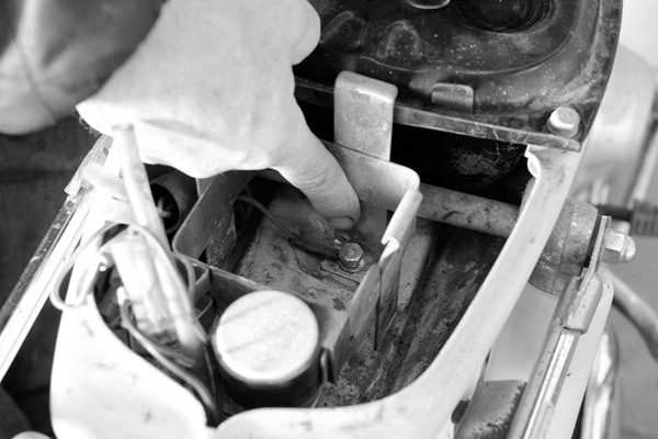 フレームに括りつけられているハーネスにコンバートキットの配線を割り込ませるので、作業の邪魔になってしまうキャブも外していきます
